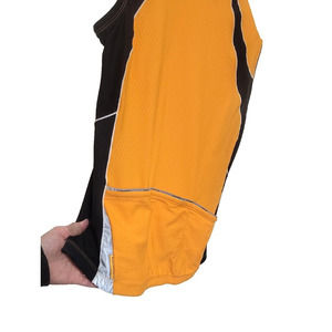 Orange and black with reflective strips. Pocket and pouches on the backside. Size L