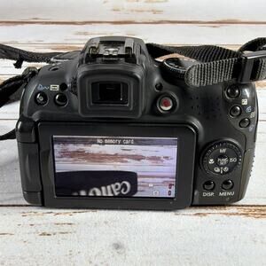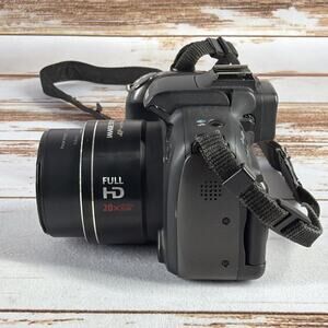 Used Canon PowerShot SX1 IS digital camera in black. 10.0 megapixel CMOS sensor with 20x optical zoom and full HD 1080p video recording. Features include image stabilization, vari-angle 2.8” LCD screen, and DIGIC 4 processor. Powers on and functions properly—lens, zoom, autofocus, and video tested. Exterior shows light wear; no cracks or major damage. Made in Japan. Includes camera only—no battery, charger, or accessories unless otherwise noted.