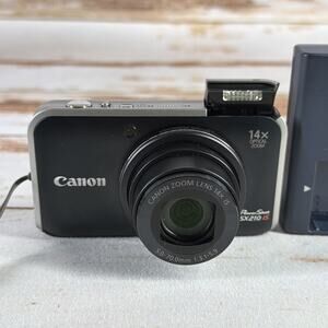 Used Canon PowerShot SX210 IS compact digital camera. Features 14.1 megapixel resolution, 14x optical zoom, and 3.0” widescreen LCD. Shoots HD video and includes built-in flash and image stabilization. Camera powers on and functions properly—lens, zoom, flash, and image capture tested. Exterior shows light wear; no cracks or major damage. Includes camera only—no battery, charger, memory card, or accessories unless otherwise noted.