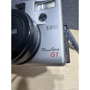 The Canon PowerShot G1 3.3MP Digital Camera is a compact camera with a maximum resolution of 3.3 MP. It features a 3x optical zoom, built-in flash, and date/time stamp. The camera is in a gray color and is part of the Canon PowerShot series. It includes a USB connectivity, lithium-ion battery, and comes with a charger. Made in Japan, this digital camera offers quality and convenience for capturing images and memories.