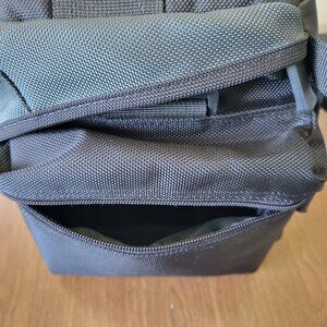 Canon Rebel Camera Bag for camera and accessories. Black camera bag with Canon Rebel logo on front flap. The interior has adjustable compartments and dividers that can be removed to create one large space. This bag also has two exterior zip side pockets. *There is no strap*