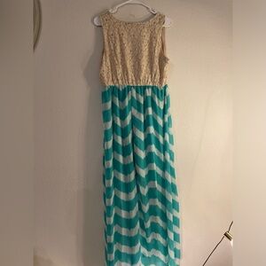Elegant sleeveless maxi dress. Features a lace top and chevron pattern skirt. Perfect for summer occasions.