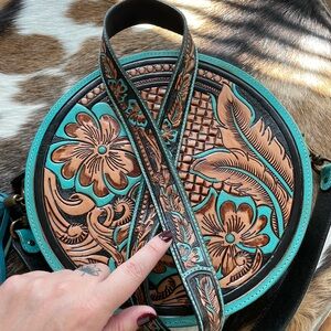 This is a tooled leather with cowhide accents canteen purse. Long strap for crossbody wear. Bought in Deadwood, South Dakota. Used only a handful of times. Great condition!