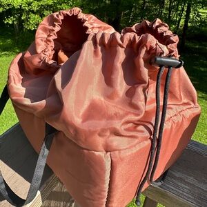 Both sides of bag has straps to carry a tripod. Inside has removable padded drawstring insert. Several pockets. Sturdy canvas.