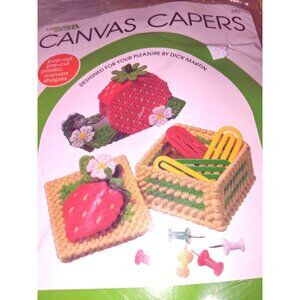 This kit includes pre-cut canvas shapes, acrylic yarn, and instructions for creating a strawberry-themed box and tape dispenser cover.