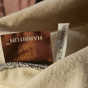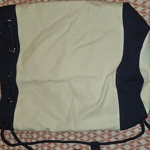 Stylish canvas backpack with black accents. Features a drawstring closure.