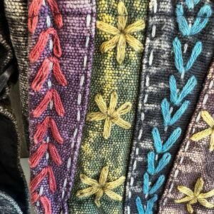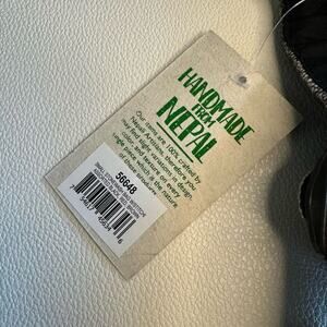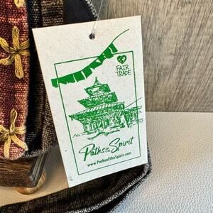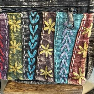 This bag is NWT, it is made with cotton with a boho design. it comes with an adjustable strap. The front flap has stitching on it and the bag is made in Nepal.