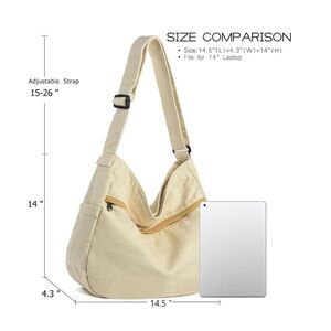 The canvas tote bag size is 14.5×4.3×14 inch, adjustable shoulder strap is 15-26 inch. Made of high quality canvas, super sturdy, soft and water-washable. This crossbody tote bag can be the essential everyday tote bag.