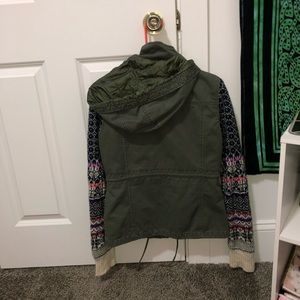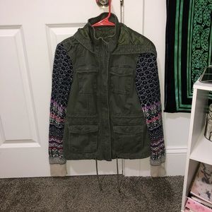This jacket is army green canvas with knitted sweater sleeves. It’s in great condition! Super cute! Perfect for fall or winter days, it’s actually really warm despite its light weight and knitted sleeves.