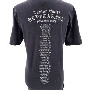 Short sleeve fitted crew neck shirt - shade of gray. Double sided graphics on the front & back from the Reputation Stadium Tour. Tour stops on the back. Material has a stretch. 100% Cotton. Made in Nicaragua.