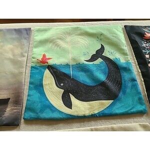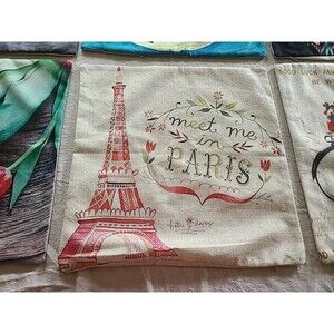 This is a lot of 6 throw pillow shams of different themes; old bicycle, flowers, Shakespeare, whale, fishing, and Paris.