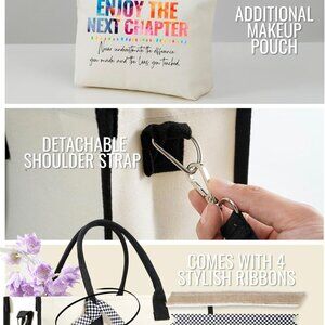 Features: Spacious tote with a top zipper to keep your essentials secure. Inside pocket for keys and small items, two side pockets for water bottles or umbrellas. Comes with a stylish set of ribbons to customize the handles.