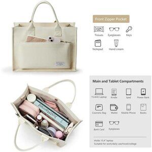 This canvas tote bag is thoughtfully designed with multiple compartments for efficient organization. It features a large main compartment, a dedicated iPad/Kindle sleeve, and a zippered pocket for valuables like your phone or keys. The front zipper pocket and side pockets provide convenient storage for essentials like water bottles and umbrellas. Perfect as a work bag, nurse bag, or college tote, this multi-pocket tote combines functionality with style.