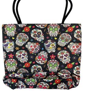 This canvas tote combines durability and style, making it a versatile companion for everyday use or beach trips. Featuring a neoprene lining, zip closure and sturdy rope handles, it is designed for both functionality and comfort. The sugar skull design is fun and eye-catching. Perfect for carrying essentials in style, whether you're running errands or enjoying a day outdoors.