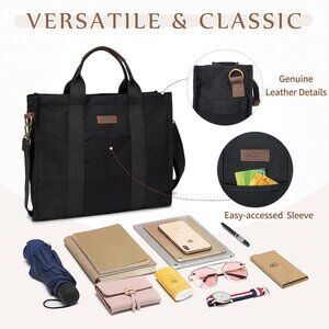 -CLASSIC DESIGN: The women's canvas work tote bag boasts a timeless design, crafted from high-quality cowhide leather details and durable canvas for long-lasting elegance. Its leather decorated handles provide comfort and a sophisticated appearance.