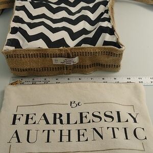Medium tote bag with burlap strap. Has one inside pocket & is open at the top.