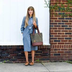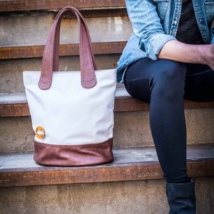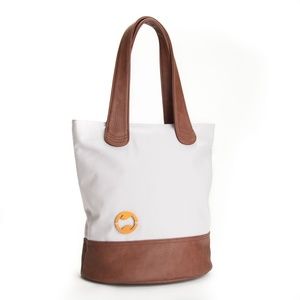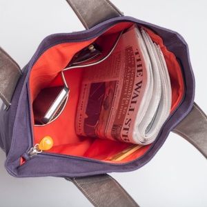 Gray laptop tote with zippered compartment and lots of pockets. Flat straps fit comfortably over the shoulder. Big enough for laptop, magazines, water bottle and more.