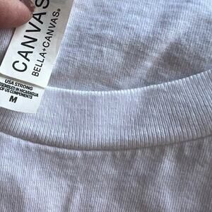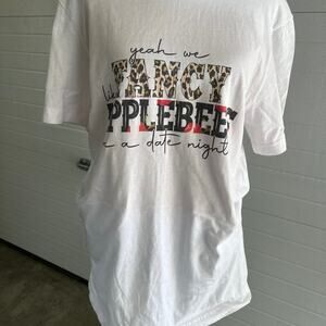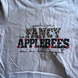 Canvas women's size M T-shirt. White short sleeve. On front.” yeah we fancy like Applebee’s on date night.”.