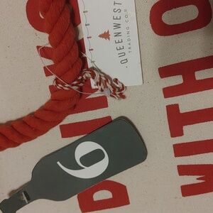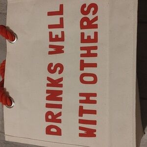 Stylish wine or canvas tote with bold red text 'Drinks Well With Others'. Features red thick Jute rope handles. Will hold 6 wine bottles.
