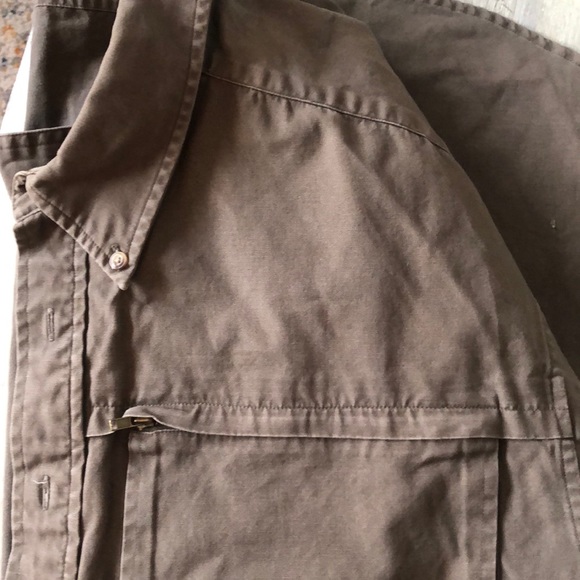 XL zipper chest pockets. Roll up or long sleeves. Army green.