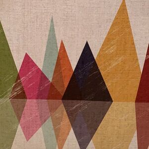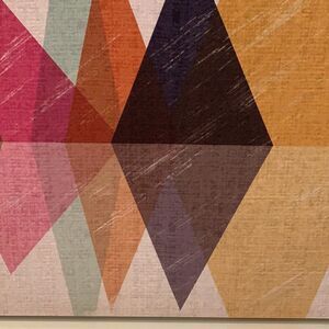 Pretty canvas wall hanging has an abstract design of bright colors on a soft tan backdrop. Top colors are bold and bottom colors are shaded. No hooks on back. 20”x20”. Excellent condition.