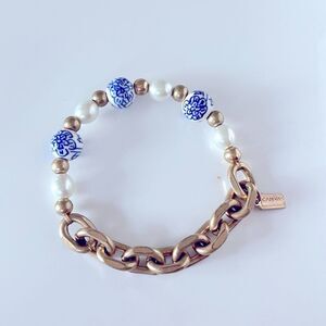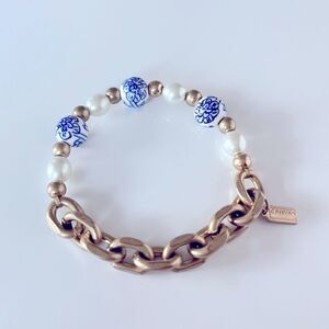 Canvas Blue & White Chinoiserie Porcelain Bead & Chunky Metal Chain Link Bracelet