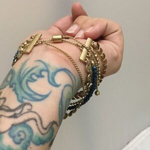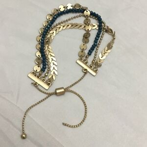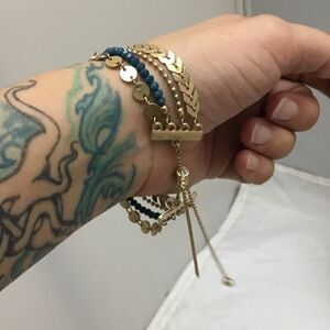 Beaded and geometric shapes layer this bracelet. Complete with an expandable closure.