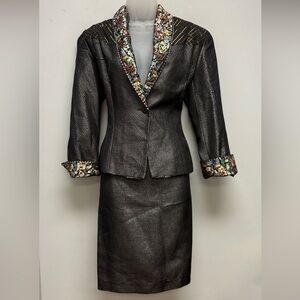 Striking two-piece suit set by Canvasbacks Luton & Horsfield, featuring a tailored blazer and matching skirt in a shimmering black metallic stripe fabric. The standout detail is the multicolor geometric tapestry trim at the blazer’s collar, lapels, and cuffs—making this set a true statement ensemble.
