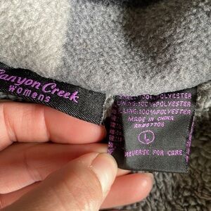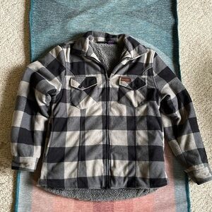 great pre loved condition size large women's, gray and black plaid flannel shacket, zipper closure, chest pockets buttons at cuffs of sleeves, super cozy and warm great for layering