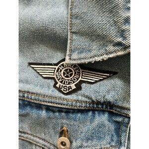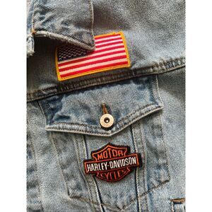 Light wash denim biker vest from Canyon River Blues with raw cutoff armholes and after market Harley-Davidson style patches. Bar & Shield + flag up front and a large winged Harley-Davidson USA patch on the back. 100% cotton, metal shank buttons, adjustable waist tabs. Distressed edges, waist pockets, and double breast pockets. Please note: base garment is Canyon River Blues, not an H-D brand vest.
