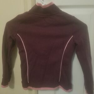 This full zip Sweatshirt is maroon and has pink lining on the hem and cuffs along with pink outlining the silhouette. The zip up has a ribbed hem, collar and cuffs. On the left chest the letter "A" is embroidered and has a halo above it and wings on either side. It has double zippers so it can be zipped from the bottom and the top. It is a small but runs small and fits more like an extra small.