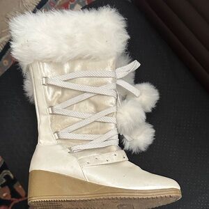 Chic ivory boots with plush faux fur trim. Features lace-up front and wedge heel. Ideal for winter wear.