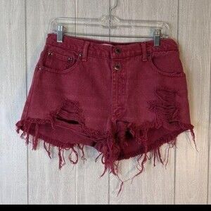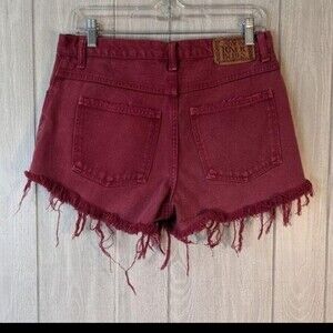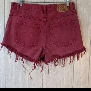 They are a pair of burgundy denim shorts that are distressed and high waisted.