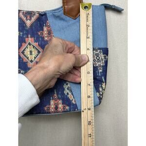 The Canyon Sky Southwestern Design & Denim Hobo Style Handbag is a medium-sized rectangular handbag made of denim in a stylish blue color. It features a zip closure and double brown faux leather handles, making it versatile for occasions like travel, parties, casual outings, workwear, and business meetings. With a lined interior and inner pockets, this handbag offers both fashion and functionality. The handbag also boasts a Western, designer, Aztec, and classic theme, adding a touch of unique flair to any outfit. Perfect for the fashion-forward woman looking for a functional yet chic accessory.