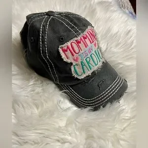Brand new distressed Mommin is my cardio logo cap. It is gray and very comfortable and adjustable to any size head. Reasonable offer accepted.