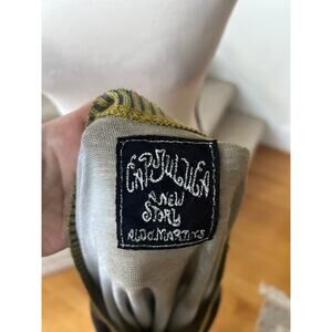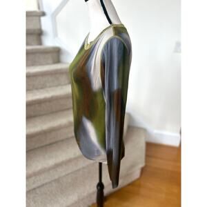 Excellent condition. Watercolor olive green, dusty blue and brown print. Long sleeve, crewneck, ribbed hems.