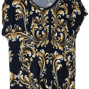FRANNE-Womens Knit Top with Cap Sleeve in Designer Black and Yellow 'STATUS' Scroll print with lace trim on shoulder and neckline