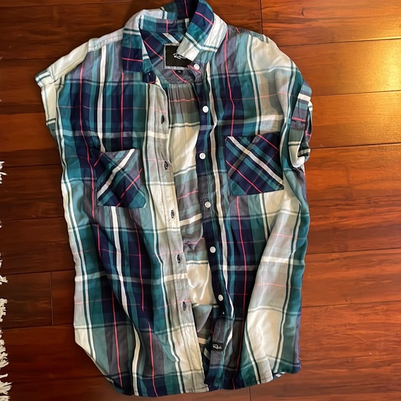 Good, used condition Rails blouse, plaid cap sleeve purchased from Anthro (I believe). Oversized fit but tts XS. Would look better on someone a bit taller. No stains rips or tears, but priced well due to age