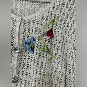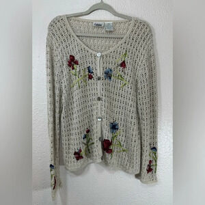 Capacity Linen Blend Crochet Open Knit Beige Floral Embroidered Cardigan Women M