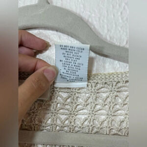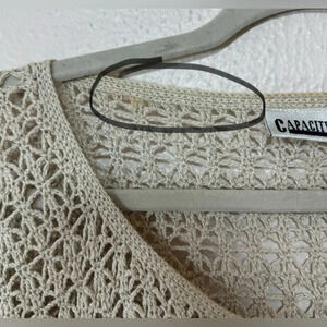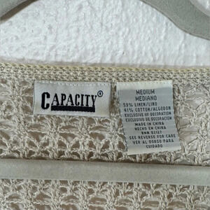 Capacity Linen Blend Crochet Open Knit Beige Floral Embroidered Cardigan Women’s Size Medium. Has a few marks and pulled threads. One of the arm sleeves is longer then the other. Made in China. Linen and cotton blend. Hand wash.
