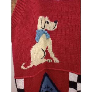 Pre-owned red cardigan sweater vest. Medium weight with cute puppies. Button down front.