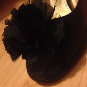 Black satin with cloth flower, peek toe. Gold inside. 4 inch heels. Only worn once!