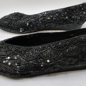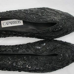 Caparros black ballet flat covered in beads and sequins. These come up high over the instep (see photo). Perfect for an elegant night out! There is no apparent wear on the sole, so I presume never worn. There is some flaking on the inside of the shoes (see photos).