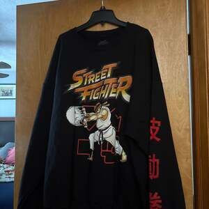 This comfortable long-sleeve sweatshirt features a large front graphic of Ryu performing a Hadouken, the iconic Street Fighter logo, and red kanji characters down the left sleeve. Perfect for fans of the retro fighting game series or streetwear enthusiasts.
