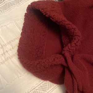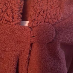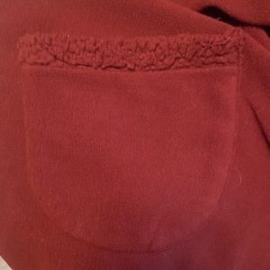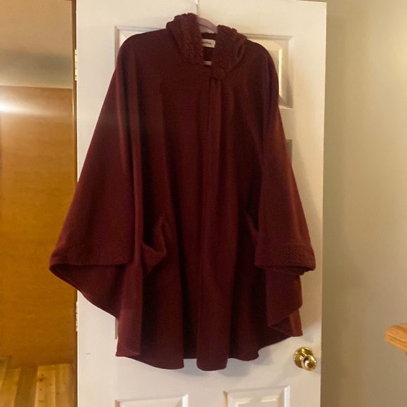 Burgundy hooded cape bottom enclosure at neckline. Pockets. The “arms” are stitched to for a pseudo sleeve that helps it stay on good. One size fits most. Roomy.