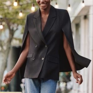 This elegant black double-breasted cape is perfect for any occasion. Its sleek design offers a timeless look, making it a versatile addition to your wardrobe.