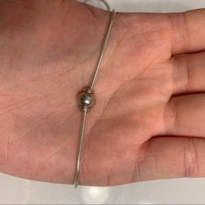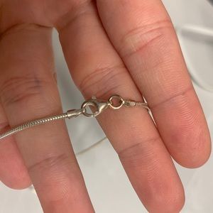 Sterling silver; length:16 inches; in perfect condition; clasp has a little color to it (maybe a little tarnish)