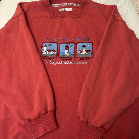 Stay cozy with this stylish red sweater featuring a Cape Cod lighthouse design. Perfect for casual outings.