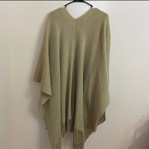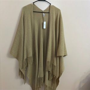 Keywords: poncho, cape, cardigan, shawl, cover up, knit, fringe, open front, beige, boho, bohemian, casual, sweater, wrap