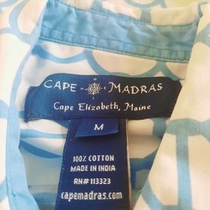 Cape Madras Womens Blue and White Geometric Print 3/4 Sleeve Button Down Collard Blouse Size Medium, Please See Measurements For Best Fit, Nice Condition!